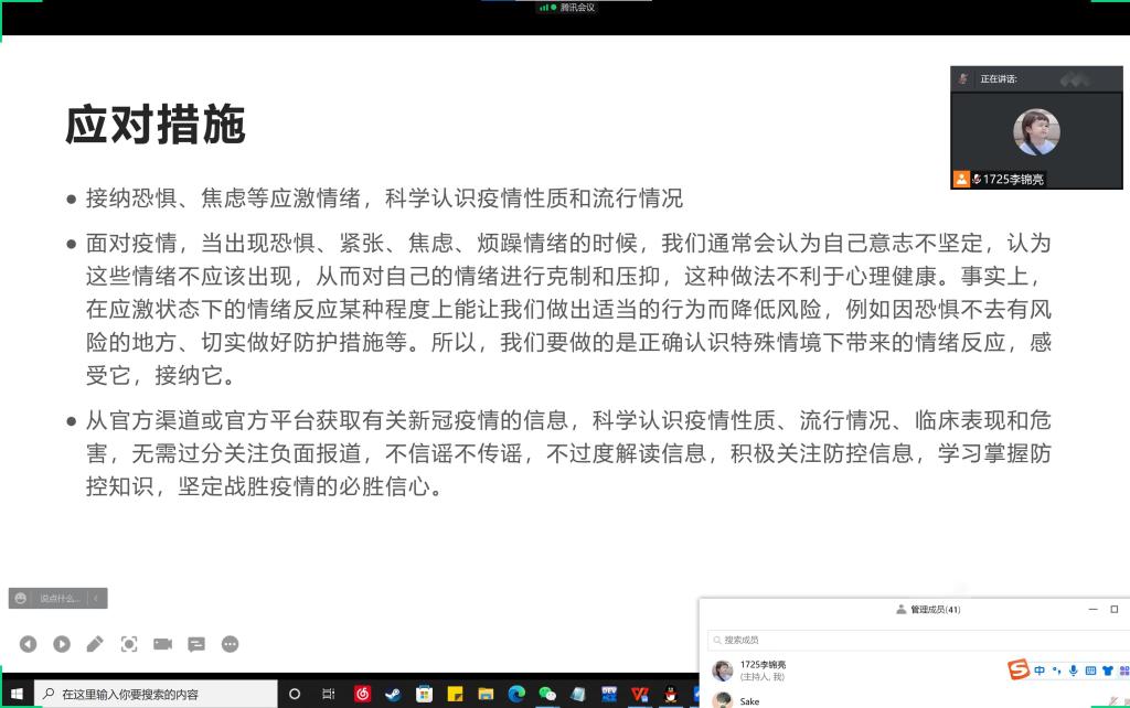 本次班会采取线上的方式进行。为取得更好的班会效果,院心理部在班会前对心理委员进行集中培训,鼓励心理委员结合自己班级实际情况,选择一个重点开展班级健心活动。本次班会各心理委员积极主动作为,有围绕疫情期间情绪疏导的,有围绕克服后疫情症状进行学业规划的,还有普及心理调适知识的……各心理委员采取PPT宣讲、线上讨论、心理健康知识视频学习等方式积极组织同学参加班会。