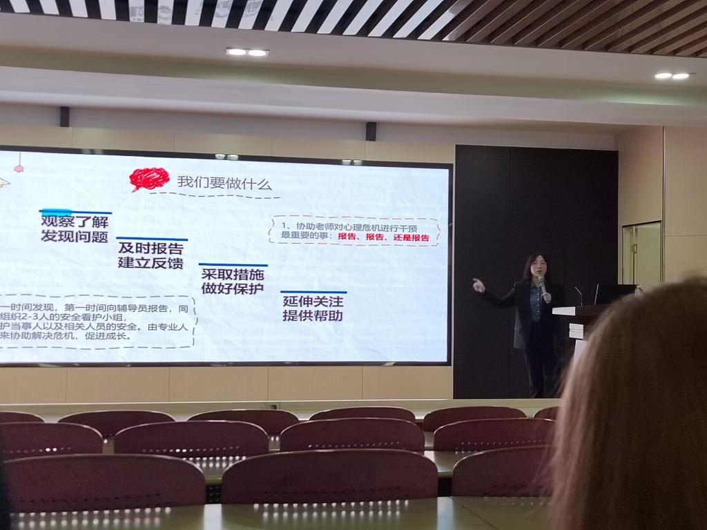 4月11日下午2:30,物电学院2022级朋辈培训之“大学生常见心理问题识别与处理”专题培训在工三A307举行。本次讲座由文新学院心理辅导员李婵老师主讲,2022级全体寝室长、心理委员、院心理部成员共150余人参加培训。