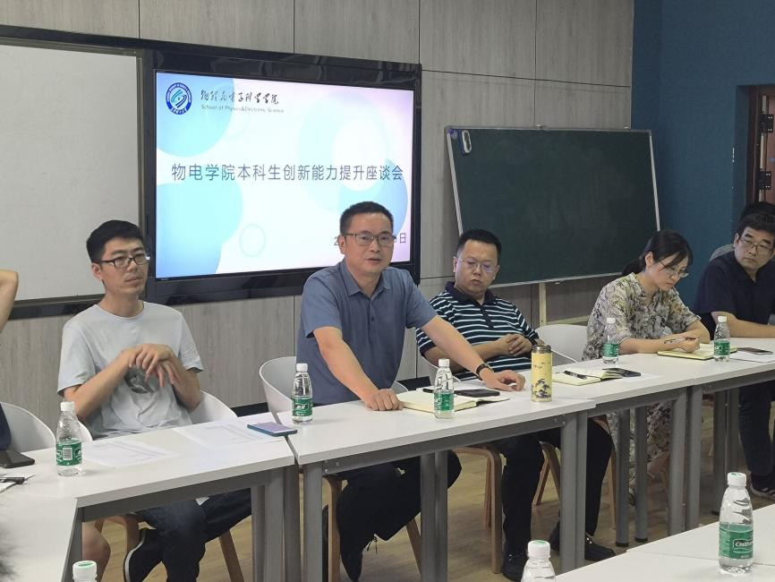6月16日下午,物电学院在理科楼C509召开本科生创新能力提升调研座谈会。院党委书记张国强、党委副书记宋国宁、副院长范志强、邹望辉老师、尹崇山老师、文勇军老师、卞立安老师、周溯源老师出席了本次会议。34名来自21、22级的科技委员、科技部成员参加了会议。