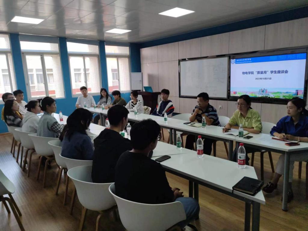 为促进我院本科人才培养高质量发展,推进课堂教学质量月活动走深走实,10月31日下午4:30,物电学院组织召开“质量月”专题学生座谈会,广泛听取学生对教学质量提升的意见和建议。物电学院党委副书记宋国宁、分管教学副院长范志强、学工办老师以及来自不同专业不同年级的14名学生代表参加会议。