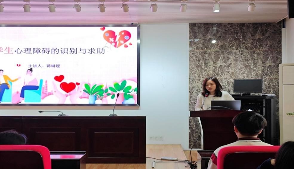 会议开始,蒋老师进行了“大学生心理障碍的识别与求助”专题培训,她从心理障碍的概述、大学生心理困扰的求助、大学生常见心理障碍的识别与防治三个方面给同学进行了讲解。通过抑郁症、焦虑症等大学生常见心理障碍,分享了从语言信号、情绪信号、行为信号、认知信号以及躯体信号识别和判断自己或他人出现心理问题的方法,鼓励大家对有心理困扰的同学做到“关注、询问、陪伴和转介”。
