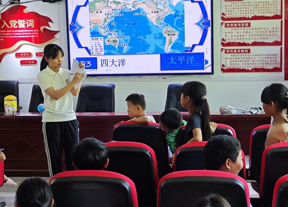 “孩子们调皮活泼,有使不完的精神气。”部分同学对四大洋八大洲倒背如流;在课间蜂拥到老师身边,指着地球仪提出自己的问题,“为什么地球是斜的?”“为什么水要画成蓝色呀?”孩子们的热情围着老师,眼里充满对知识的渴望。
