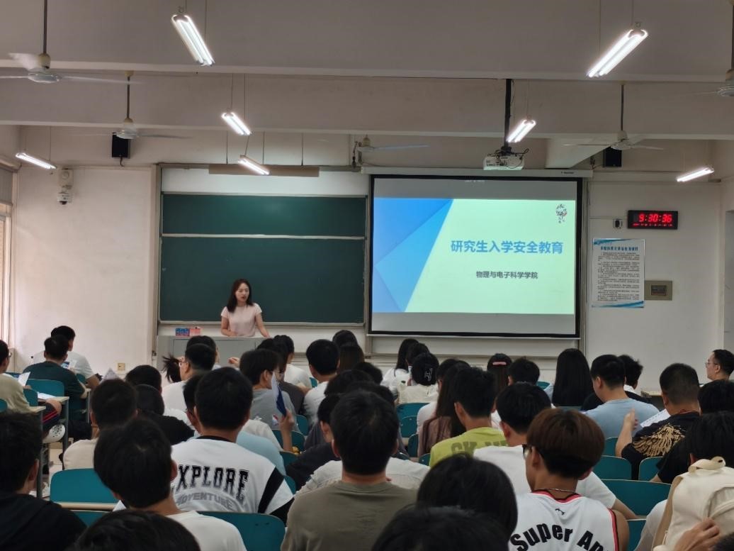 9月13日上午9:30,物电学院2024级研究生入学教育之安全教育大会在文科楼E201举行。本次会议由研究生辅导员蒋琳嫒主持,24级全体研究生参加。