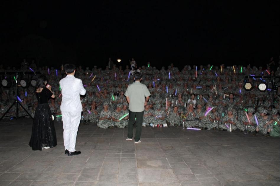 正式演出前,年级辅导员郭晨鑫带领同学们进行了军歌演唱,同学们热情高涨,现场气氛如火如荼,同学们以整齐划一的动作和铿锵有力的嗓音,展现了军训期间培养出的团队精神和纪律性。