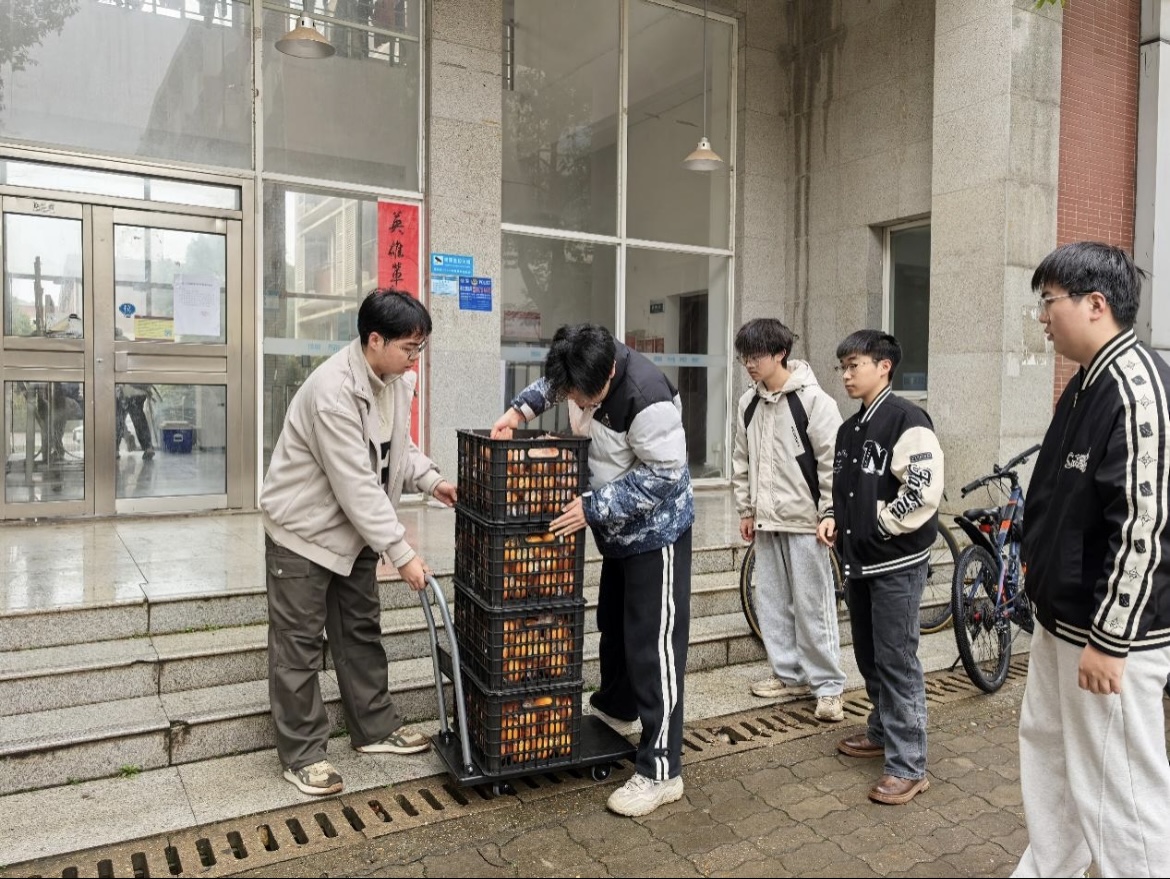 销售现场,一筐筐新鲜运达的脐橙码放整齐,物电学院志愿者们各司其职,展现出高效的协作能力——运输组的志愿者确保售卖点有充足的橙子供应;售卖点的志愿者“各显神通”,有的负责打包橙子,有的负责称重,还有的当起了“代言人”,卖力推荐。在志愿者的积极推广和师生的热心支持下,汀香园的橙子售卖在首日早晨就销售了150斤。一位志愿者感慨道:“看着一框框新鲜的橙子被售出,心中充满了成就感!”