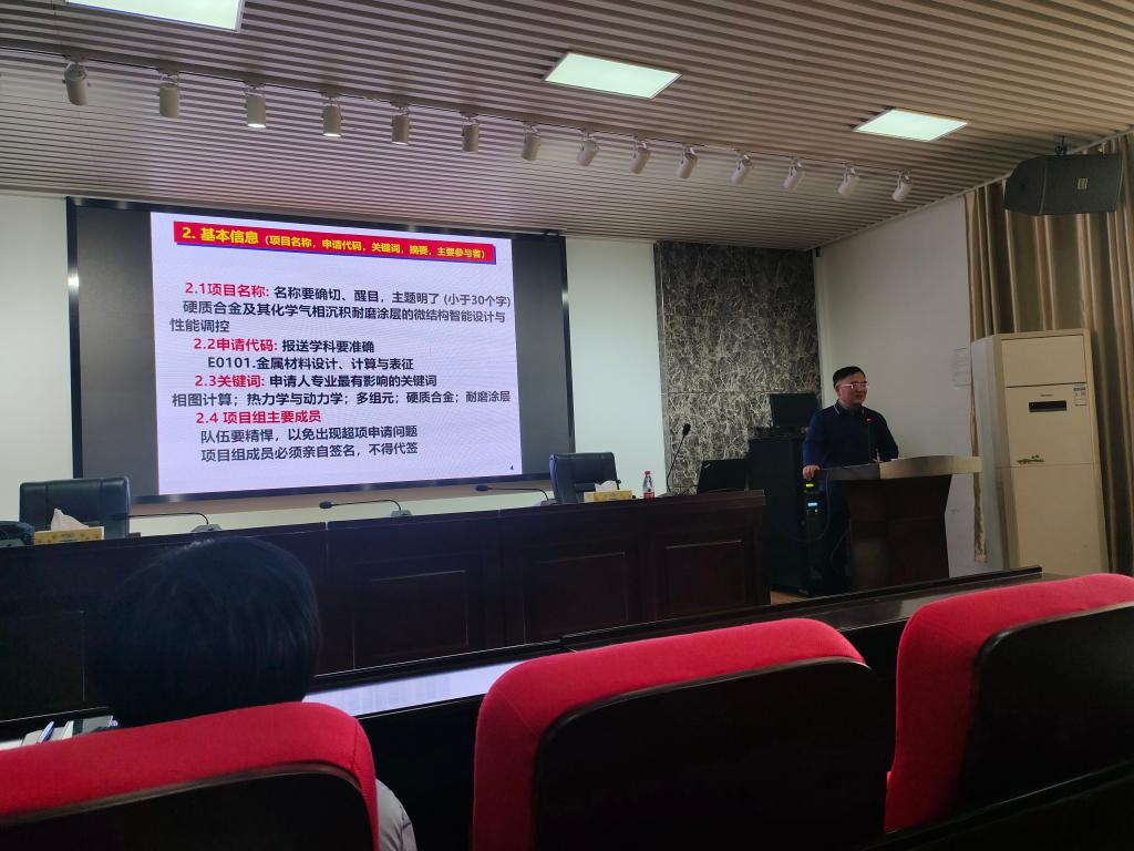 杜勇教授是中南大学二级教授,博士生导师,粉末冶金国家重点实验室副主任,中德电化学存储系统集成计算材料工程联合实验室”和”中德微结构联合实验室”主任,国家杰青,长江学者,973首席科学家,国家基金委创新群体负责人。杜教授根据自己多年国家自然科学基金项目申报和研究的经验,从选题、框架设计、项目创新、申报书的细节组织等各个方面与大家分享。老师们认真聆听,还不时与杜教授进行探讨,收获颇丰。随后我院青年教师李茜还将自己成功申报国家自然科学基金青年项目的经验与老师们进行了分享。
