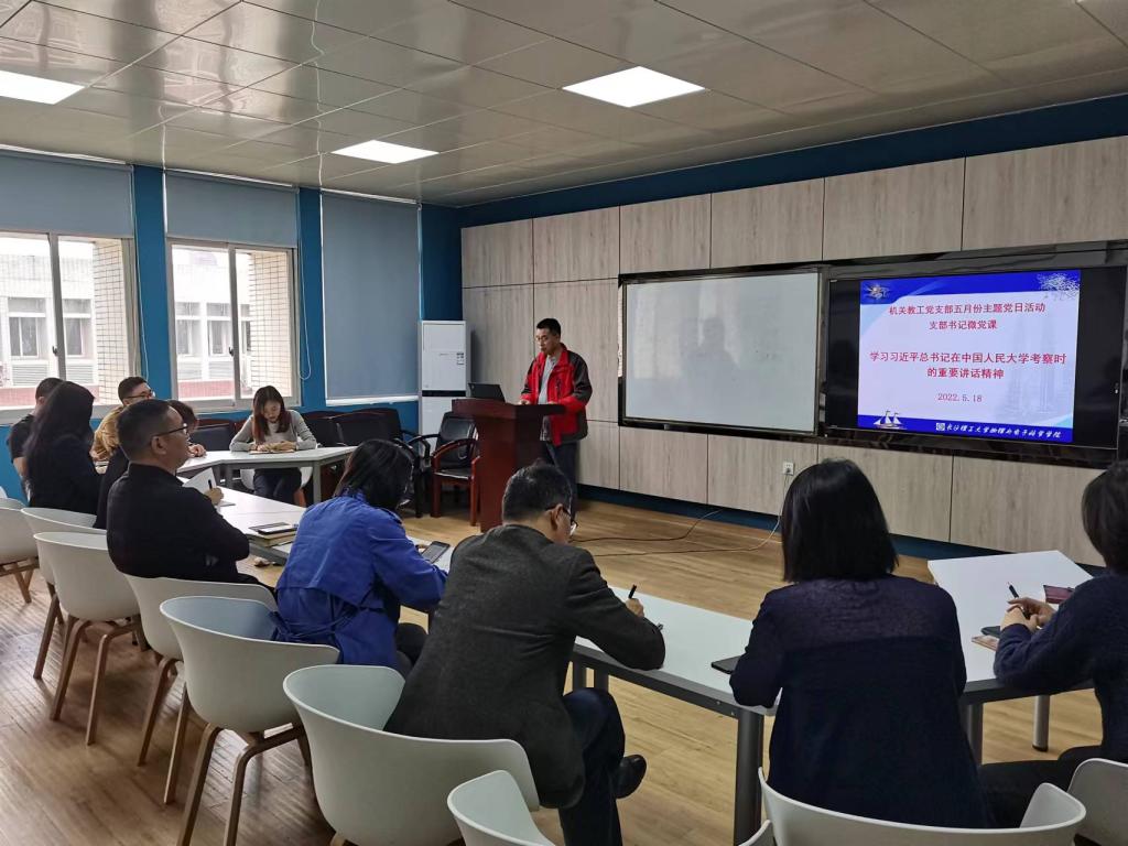5月19日,物电学院机关教工党支部在理科楼C509组织开展了主题党日活动,支部书记任鹏为全体党员上微党课,这也是物电学院党委的统一部署和要求。此次微党课的内容是学习习近平总书记在中国人民大学考察时的重要讲话精神。