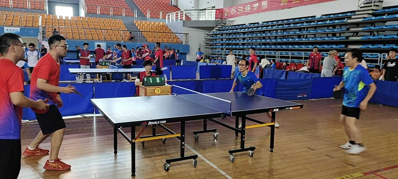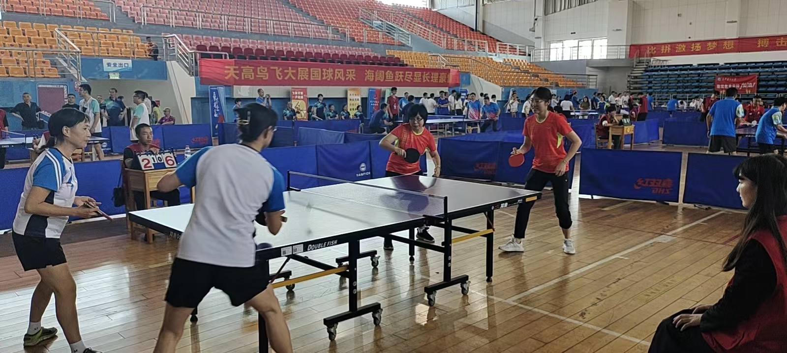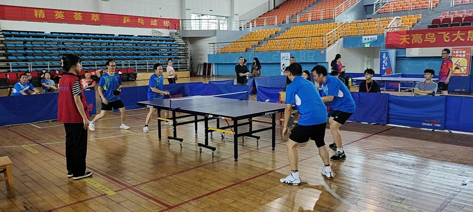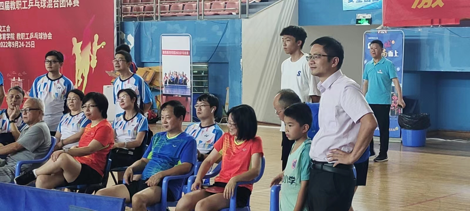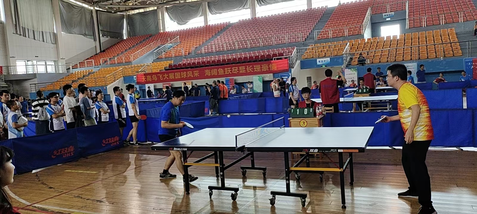 学院对此次乒乓球比赛高度重视,比赛期间,党委书记张国强、副院长张卫兵亲临比赛现场为运动员加油助威,张国强书记担任球队领队,党委副书记宋国宁、副院长兼分工会主席刘斯作为运动员亲自上场比赛。即将退休的厉江帆、袁剑辉两位教授也被邀请加入球队,在比赛中敢打敢拼,为学院荣誉而战,给年轻人树立了榜样。在主力队员刘新海、杨昌虎、廖家欣等几位老师的带领下,年轻队员们也都打出了气势,比赛场面精彩纷呈,打出了物电学院的精气神、打出了物电人的精神风貌。