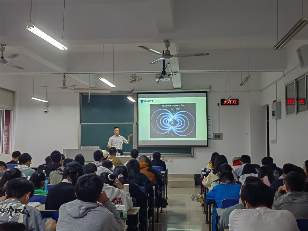张赛博士分别从神秘的极光、极光的观测、极光的产生、极光千米波、目前的研究进展这六个方面展开,向同学们讲述了地球极光的魅力与其背后蕴含的科学知识,介绍了磁纬度、地磁活动强度、波粒相互作用、极光区千米波辐射等相关知识,极大地激发了在场同学们的兴趣。