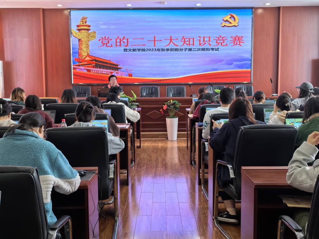 为深入贯彻落实党的二十大精神,积极探索“互联网+党建”的新模式,进一步提升积极分子的理论知识能力水平,11月27日12时30分,“党的二十大知识竞赛暨文新学院2023年秋季积极分子第二次模拟考试”于伟德金盆岭校区九号教学楼218室成功举行。