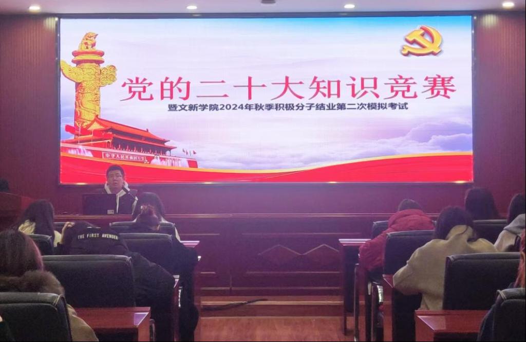 为贯彻落实党的二十大精神,积极探索“党建+互联网”新模式,进一步提升积极分子的理论知识水平,11月25日12时10分,“党的二十大知识竞赛暨文新学院2024年秋季积极分子第二次模拟考试”于伟德金盆岭校区九号教学楼218室成功举行。