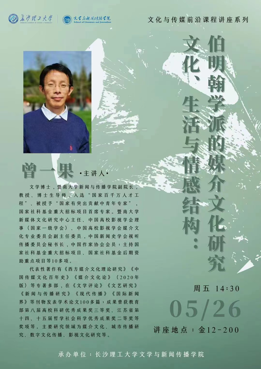 曾一果,文学博士,暨南大学新闻与传播学院副院长、教授、博士生导师,入选“国家百千万人才工程”、被授予“国家有突出贡献中青年专家”国家社科基金重大招标项目首席专家。暨南大学新媒体文化研究中心主任、中国高校影视学会理事(国家一级学会)、中国高校影视学会媒介文化专业委员会副主任委员,中国新闻史学会视听传播委员会秘书长,中国作家协会会员:主持国家社科基金重大招标项目、国家社科基金后期资助重点项目等10多项。