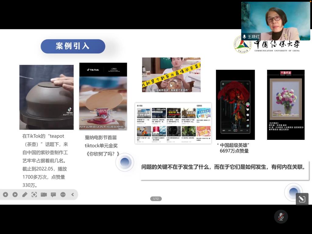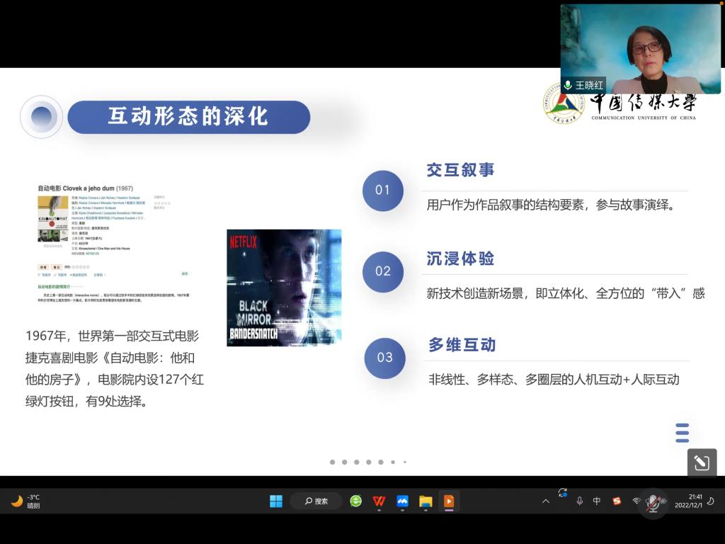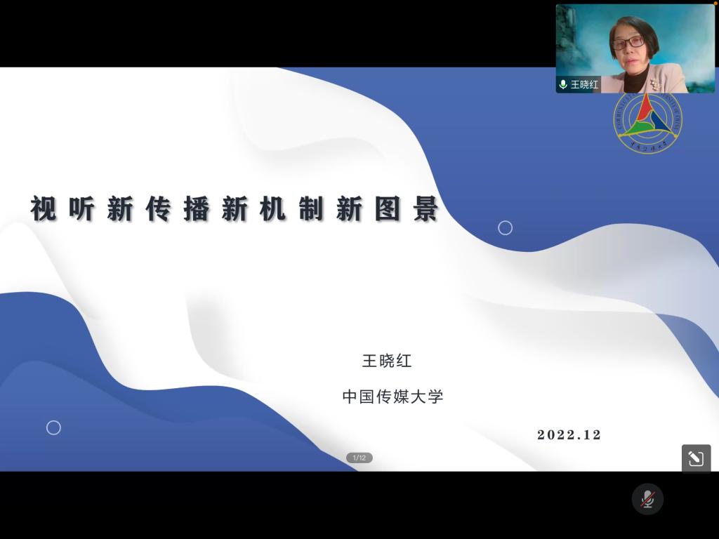 2022年12月1日晚,第十四届研究生云影讲坛文学与新闻传播学院分论坛第五期如期举行。中国传媒大学本科生院院长王晓红教授应邀为伟德师生开展主题为“视听新传播新机制新图景”的讲座。本次讲座以线上的方式进行,院长刘建新教授担任主持,赵继光老师、陈健强老师参与讲座。