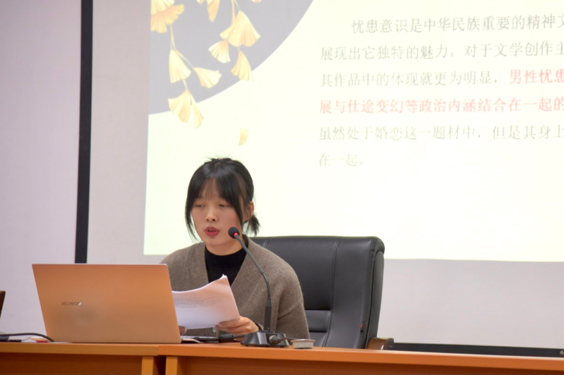 学生分享环节由古代文学研二在读的董娇同学与吴启夏同学带来。董娇同学以“宋元南戏婚恋题材中体现的忧患意识”为主题,围绕宋元南戏时婚恋题材中男性与女性身上透露出明显不同的忧患意识展开,细致剖析不同剧中人物对于命运的选择、当时的时代背景与忧患意识的联系。