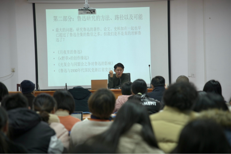 活动分为两部分进行,教师主讲与研究生主讲。王雨佳博士担任此次活动的教师主讲,王老师就“鲁迅研究的方法、路径以及可能”这一主题进行分享。他讲述了关于现代文学研究范式的几种基本类型,并以王彬彬教授鲁迅研究的四篇文章为代表评述鲁迅研究的方法路径以及可能。在分享中他提出:鲁迅研究已走过了一个世纪的时间,关于鲁迅的研究著作、论文、史料等早已超过了鲁迅全集的数倍之多,现在再去研究鲁迅需要的不仅仅是对鲁迅作品的研读,还有对当时环境以及鲁迅的人际关系进行细致的分析。分享结束后,评委老师们在分享的基础上对当代研究生研究方法给出了建议,他们认为在做学术研究时从史时出发去做研究,在“求真”的基础上对研究对象进行细致的研究。