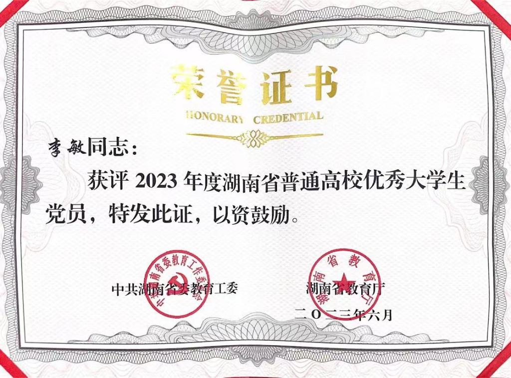 在中国共产党成立102周年之际,中共湖南省委教育工委、湖南省教育厅发布通知,根据《关于评选表彰2023年度湖南省普通高校优秀大学生党员的通知》精神,经评选推荐、资格审核、评审公示,我院中国语言文学专业2021级硕士研究生李敏荣获“2023年度湖南省普通高校优秀大学生党员”荣誉称号。