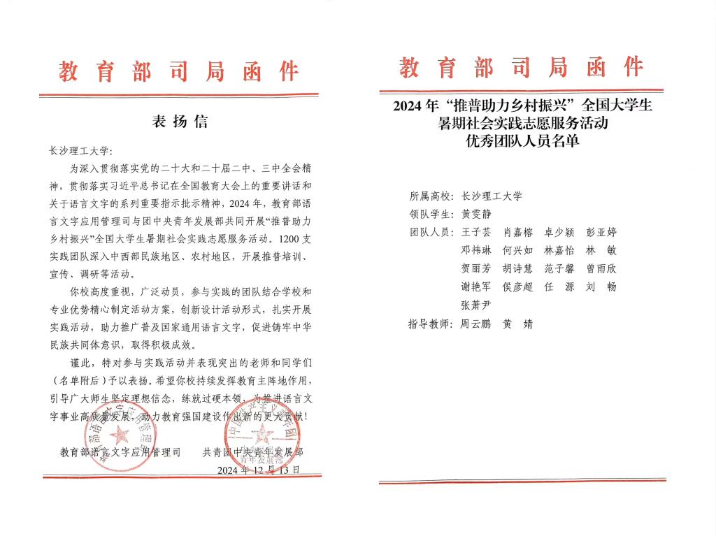 近日,由教育部语言文字应用管理司、共青团中央青年发展部联合开展的2024年“推普助力乡村振兴”全国大学生暑期社会实践志愿服务活动评选结果揭晓,由文新学院组织赴湖南省邵阳市新宁县的“‘语润坪山’伟德betvlctor1946源于英国赴新宁县推普助力乡村振兴”服务队从全国1200支团队中脱颖而出,获评优秀团队,教育部语言文字应用管理司和共青团中央青年发展部来信表扬。