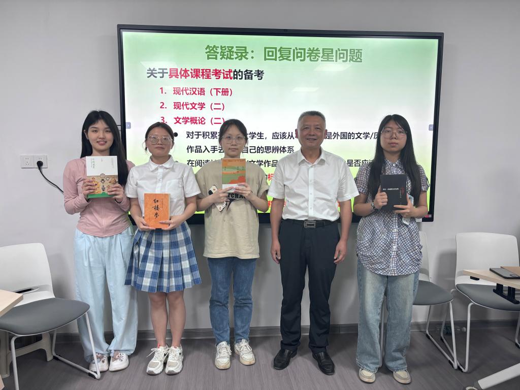 在自由提问环节,同学们积极提问。对于“如何满足中文专业在作品阅读积累、知识体系构建、思辨能力培养等多方面要求”的问题,周云鹏老师建议先夯实基础,再研读专业文献。在考研复试技巧方面,老师们建议学生大胆展现沟通能力,灵活关联知识,把握机会展现自身优势与能力。