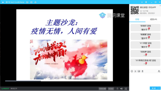 接着是会议的第二个主题,董外平老师邀请同学们分享对疫情的所思所感,在网络课堂,同学们积极发言,段晨嘉同学感慨道,“岁月静好,是因为有人在为我们负重前行,感谢那些在疫情中为我们奔赴前行的人,是他们用肩膀为我们承担了危险。我们要记住,我们是幸运的,因为我们只是被困在家里,但有些人却被永远地困在了2020。我们应该铭记他们。
