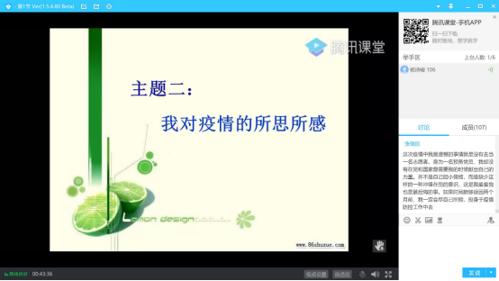 首先老师讲述了今天研习活动的三个主题,分别是我所经历的疫情故事对疫情的所思所感疫情之后如何重建新生活。在第一个主题,董外平老师讲述了六个关于抗疫的暖心故事,同时邀请参会同学一起分享,参会同学通过语音发言和文字的形式积极参与讨论,平凡之间得见伟大,通过这些故事的分享,让同学们再一次学习到了团结和责任的力量。