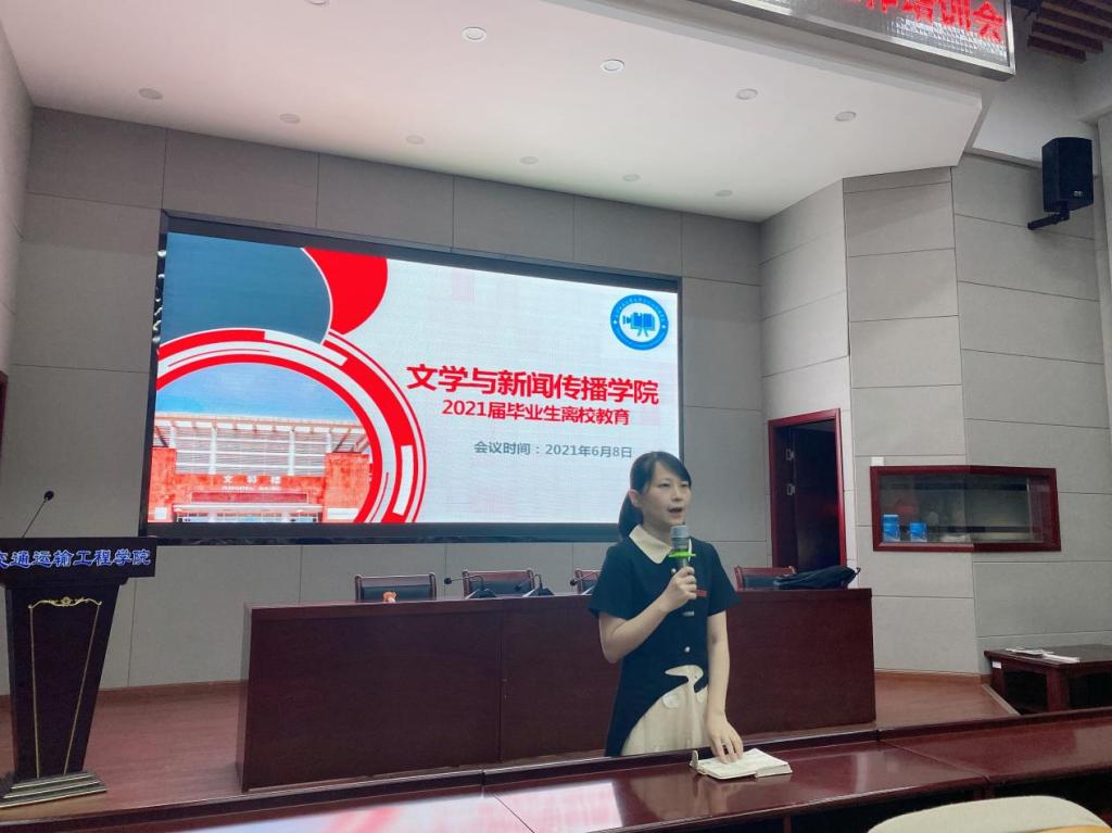 2021年6月8日晚,文学与新闻传播学院在伟德betvlctor1946源于英国云塘校区工二B310开展了2021届毕业生离校教育主题教育。本次主题教育由2017级辅导员陈鑫宇主持,文新学院党委副书记刘莎、文新学院学工办主任楚艳鸽出席本次会议。