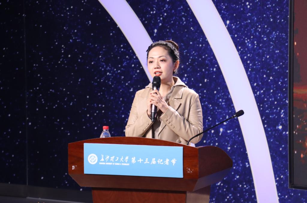 黄京则以“记者的星辰大海”为主题进行分享,以亲身经历畅谈记者初心,鼓励新闻学子一定要在自己的专业领域深耕细作,走专业化道路,做专业性人才。她谈到:“这个世界是一波人昼夜不停地运转,另一波人醒来后发现世界变了。如果你选择记者这个职业,你一定是昼夜不停运转的那一波人。”一席话让在场同学热血澎湃。