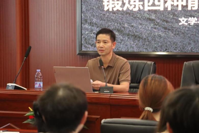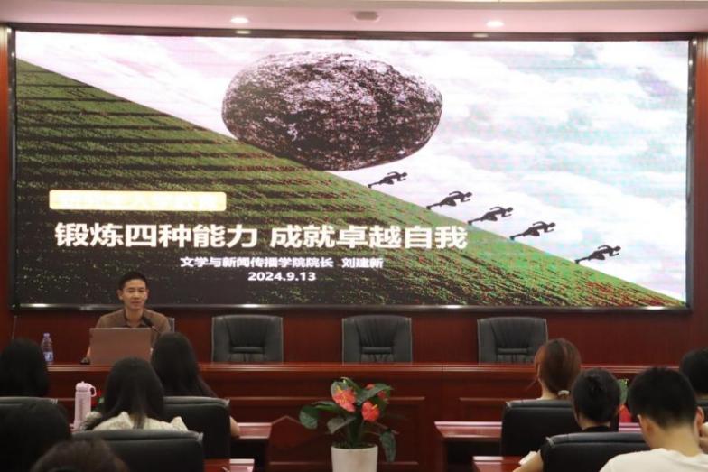 9月13日下午,文学与新闻传播学院在金盆岭校区九教218报告厅召开“院长第一课”。文学与新闻传播学院院长刘建新担任主讲人,2024级全体研究生新生聆听了此次讲座。