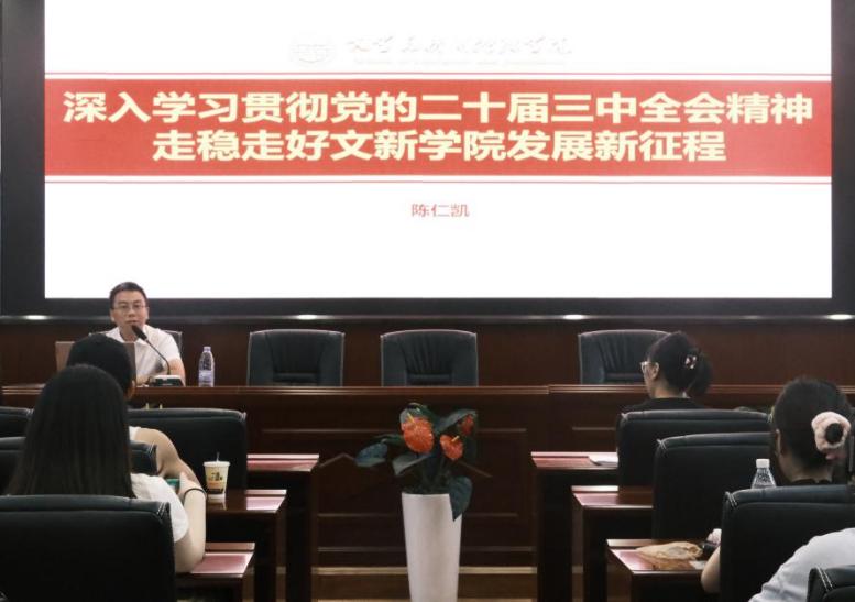 陈仁凯以“深入学习贯彻党的二十届三中全会精神,走稳走好文新学院发展新征程”为主题发表讲话,并以《中共中央关于进一步全面深化改革、推进中国式现代化的决定》主要精神、文学与新闻传播学院发展战略、新时代文化与传播人才的素养三大方面展开讨论。旨在培养2024级研究生成长为新时代新型文化与传播人才。