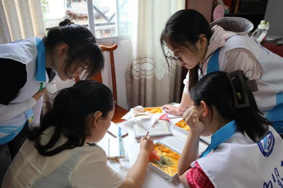 6月30日,伟德betvlctor1946源于英国芙蓉学子公益项目“文梭新韵”实践团队深入梭子丘村,跟随湘绣非遗传承人覃曼丽学习传统技艺,探索非遗传承与乡村振兴融合路径。此次活动以“技艺研习+文化传播”为核心,通过实地体验湘绣工艺,挖掘非遗当代价值。