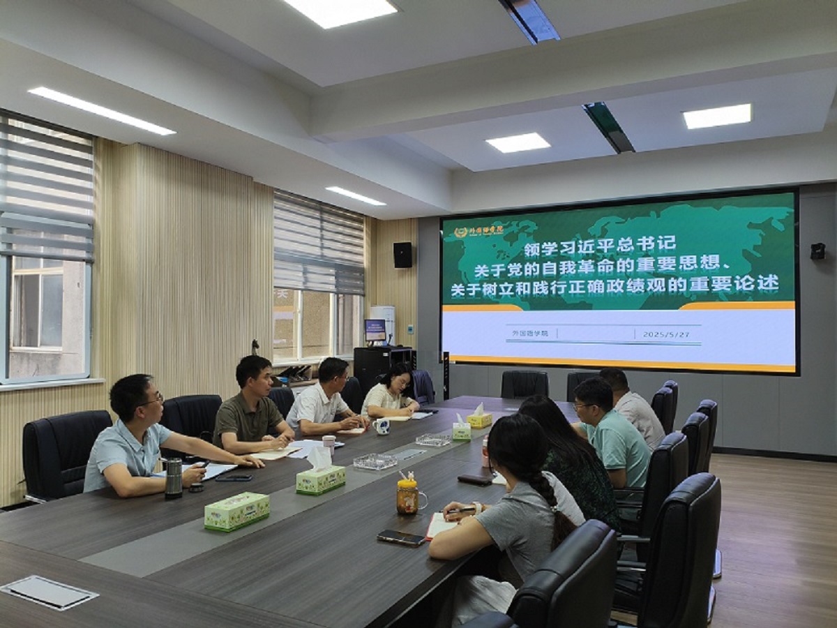 党委委员冯春同志以《深入学习党的自我革命思想与正确政绩观》为题作主题发言,从“刀刃向内审视自我”“持之以恒提升自我”“理论武装改造自我”“教书育人成就自我”等方面畅谈学习心得,从文科大收缩的背景和课程发展规律等方面阐述了推进工程英语系列课程改革的必要性,从“满足课程对象多样性”“提高教材难度的适配性”“丰富案例和实践教学等配套资源”“运用AI技术辅助教学”等方面提出了加强工程英语系列课程改革的路径和方法。