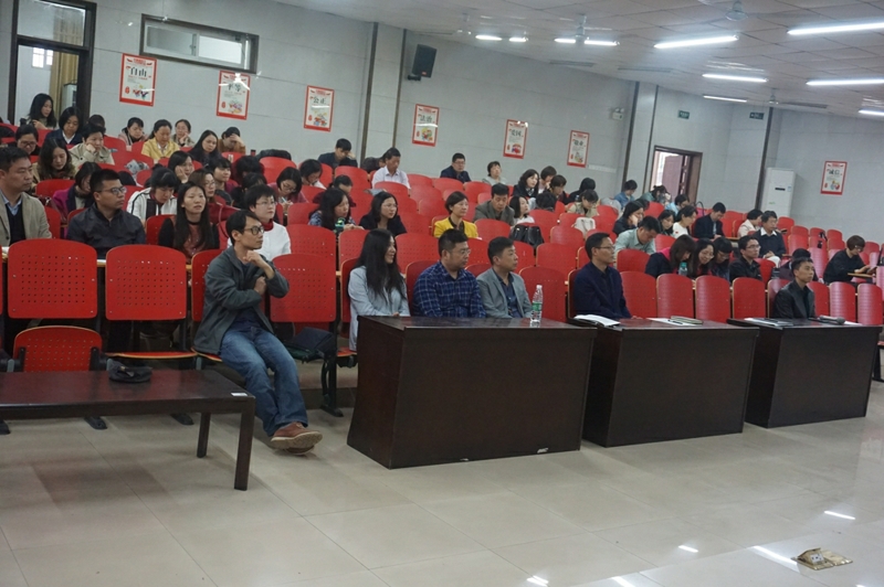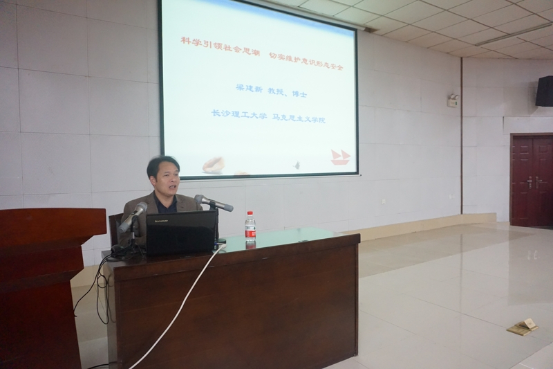 2018年4月24日下午,外国语学院组织第三次教职工政治学习,邀请马克思主义学院副院长梁建新教授讲授《科学引领社会思潮 切实维护意识形态安全》。学院党政班子全体成员率全院教职工参加学习。