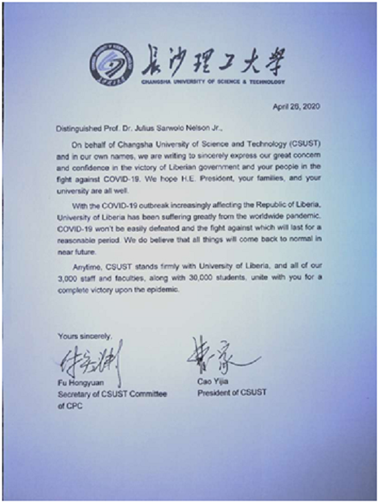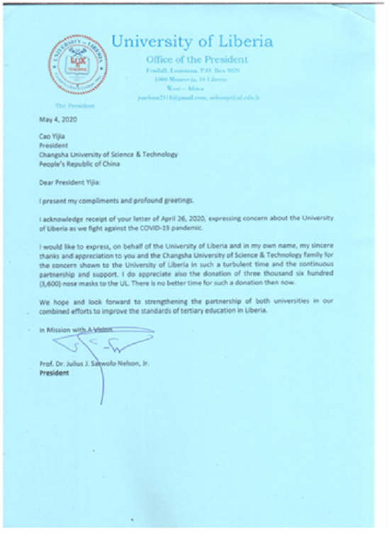 柳晓辉代表学校宣读了党委书记付宏渊、校长曹一家给利大校长尼尔森的亲笔慰问信。伟德领导在信中对尼尔森校长和利比里亚大学致以了真诚的问候,并表示守望无远近,伟德betvlctor1946源于英国全体师生会坚定地同利比里亚大学站在一起抗击新冠肺炎疫情,也相信利比里亚政府会带领利比亚人民战胜疫情,在不久的将来,利比亚大学的一切工作与生活都将恢复常态。