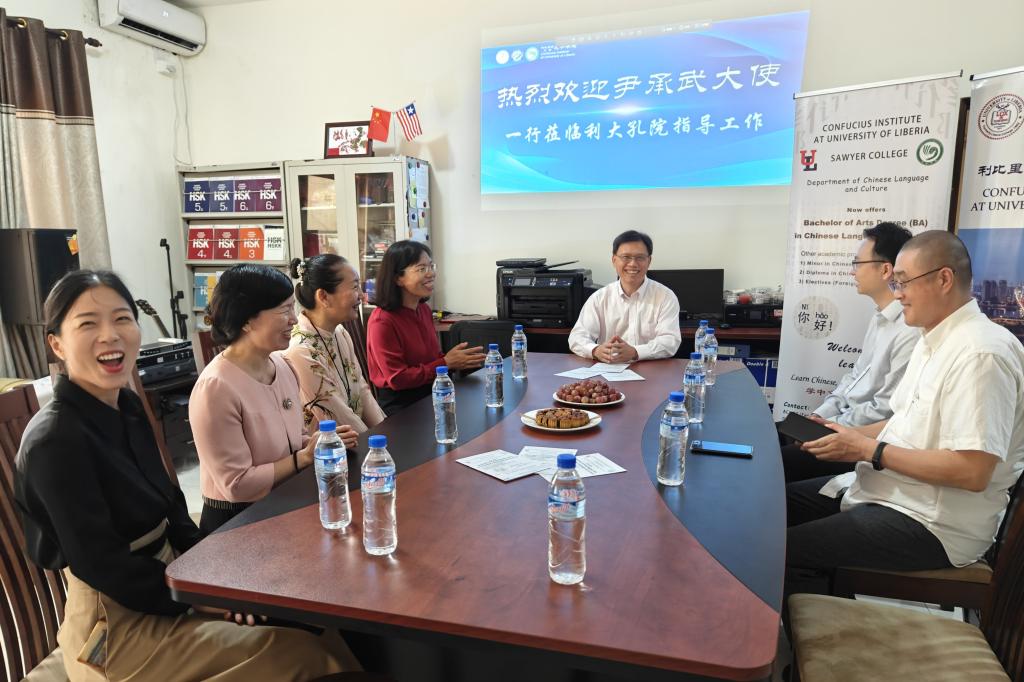2023年9月29日,中秋佳节之日,中国新任驻利比里亚大使尹承武一行来到利比里亚大学孔子学院驻地,亲切慰问了利大孔院全体中方教师并与之座谈,同行人员有参赞范尔为、李江,秘书苟飞、孙兴伟等。