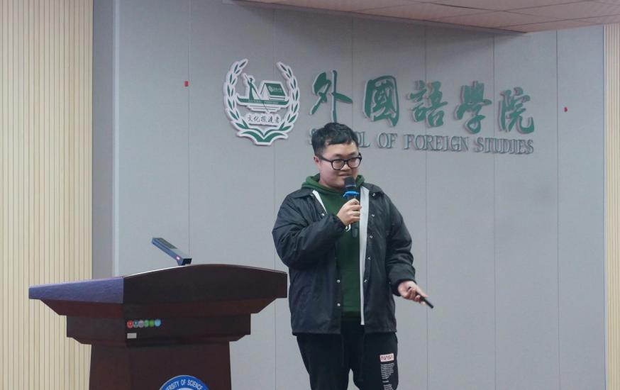 而后,刘欣阳就CATTI(全国翻译专业资格考试)和同学们分享了他的备考经验。他从翻译考试类型、通过率、笔译与口译不同的备考方法展开了论述,并向大家推荐了口笔译备考相关书籍。在互动环节中,他设计的短时记忆测试游戏激起了大家的兴趣,同学们纷纷举手参与挑战,现场气氛热烈。