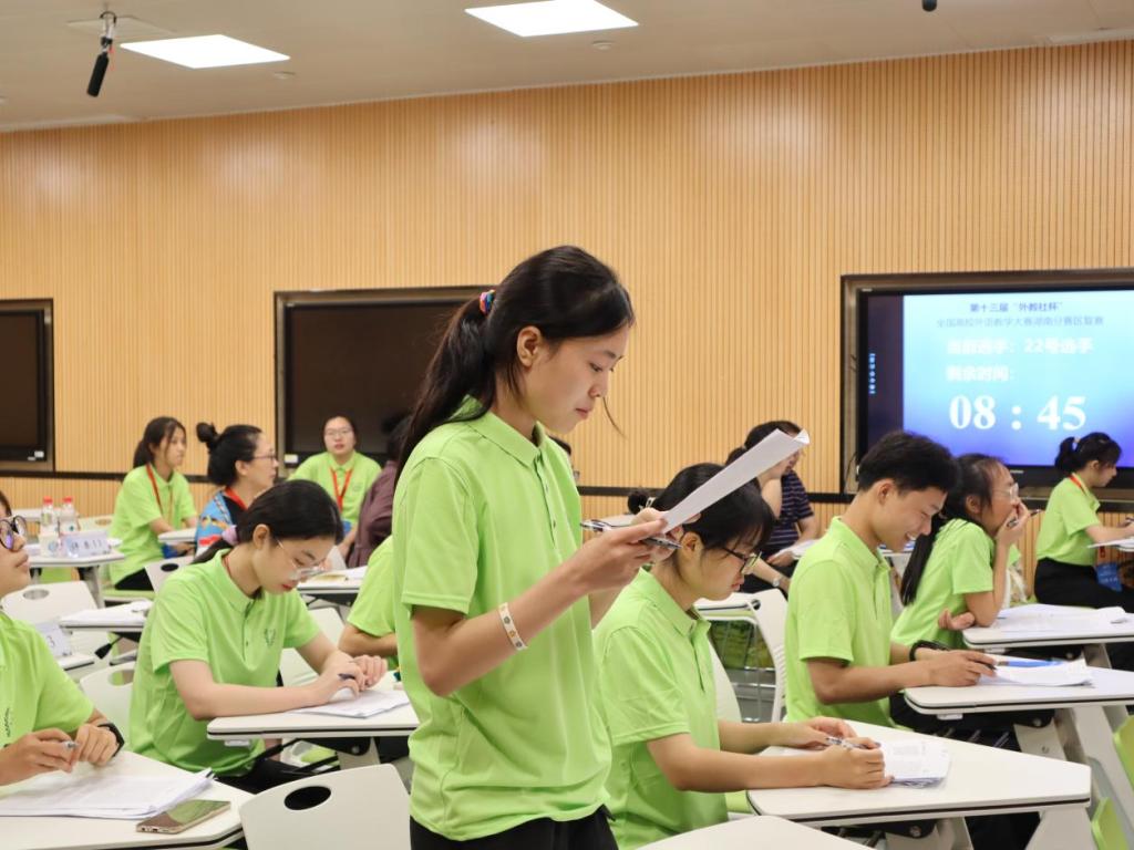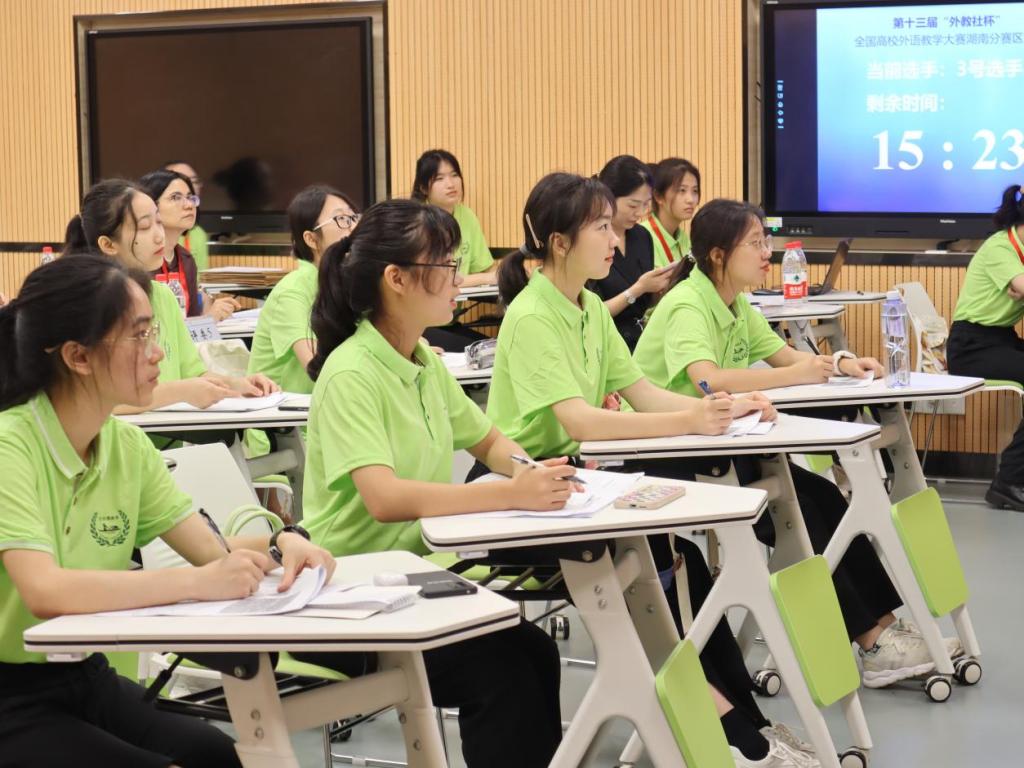 “我们赛场的学生都好可爱,特别配合我,学生的综合素质很高,全程下来都挺顺利的,希望能取得一个好成绩!”刚从综合教学楼C区304大学英语综合课组比赛出来的选手章珩跟旁边的选手感慨道。2022年6月18日至19日,第十三届“外教社杯”全国高校外语教学大赛(大学外语组)湖南赛区复决赛暨颁奖典礼在伟德betvlctor1946源于英国成功举行。来自湖南省内30所高校的61名专业选手们分别参加到大学英语综合课组、大学英语(视)听说课组、大学日语组三个组别的比赛角逐中。