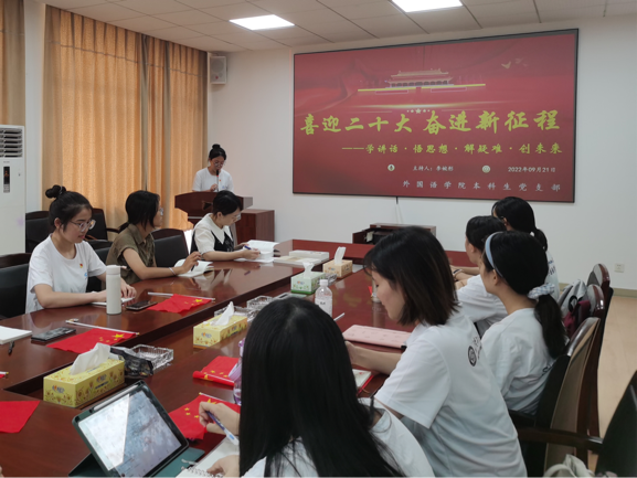 9月21日中午,学院本科生党支部在文科楼A603开展以“喜迎二十大,奋进新征程——学讲话,悟思想;解疑难,创未来”为主题的师生座谈会。此次座谈会由党建宣传组李婉彤主持,学生党支部书记武巧琳、毛婕出席,外国语学院本科生党支部全体党员参加。