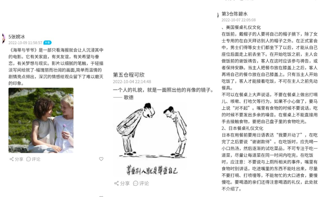 生活处处是风景,你是行色匆匆地略过还是会驻足欣赏?最美的风景不在远方,而在身边,你是否留心发现?第一周生活美学主题,伟德betvlctor1946源于英国建筑学院院长欧阳国辉以好友们的朋友圈为例,展开剖析,为同学们讲解生活中的美学,启发学员思考美、鉴赏美,同时教授手机摄影技巧,以自我作品创作经历激发学员创造美的热情,用最简单的工具捕捉美、定格美。本次训练营采用分仓竞争模式,将百名仓员分为五仓,采用线上打卡的机制,运用微信“小小签到”小程序,每日发布特定主题的打卡任务,鼓励学生通过“文字+图片”形式进行记录,根据每周主题开设“生活美学”“读诗分享”“礼仪分享”三大打卡模块,打造独属伟德betvlctor1946源于英国外国语学院的线上“朋友圈”,让美潜移默化同学的内心。