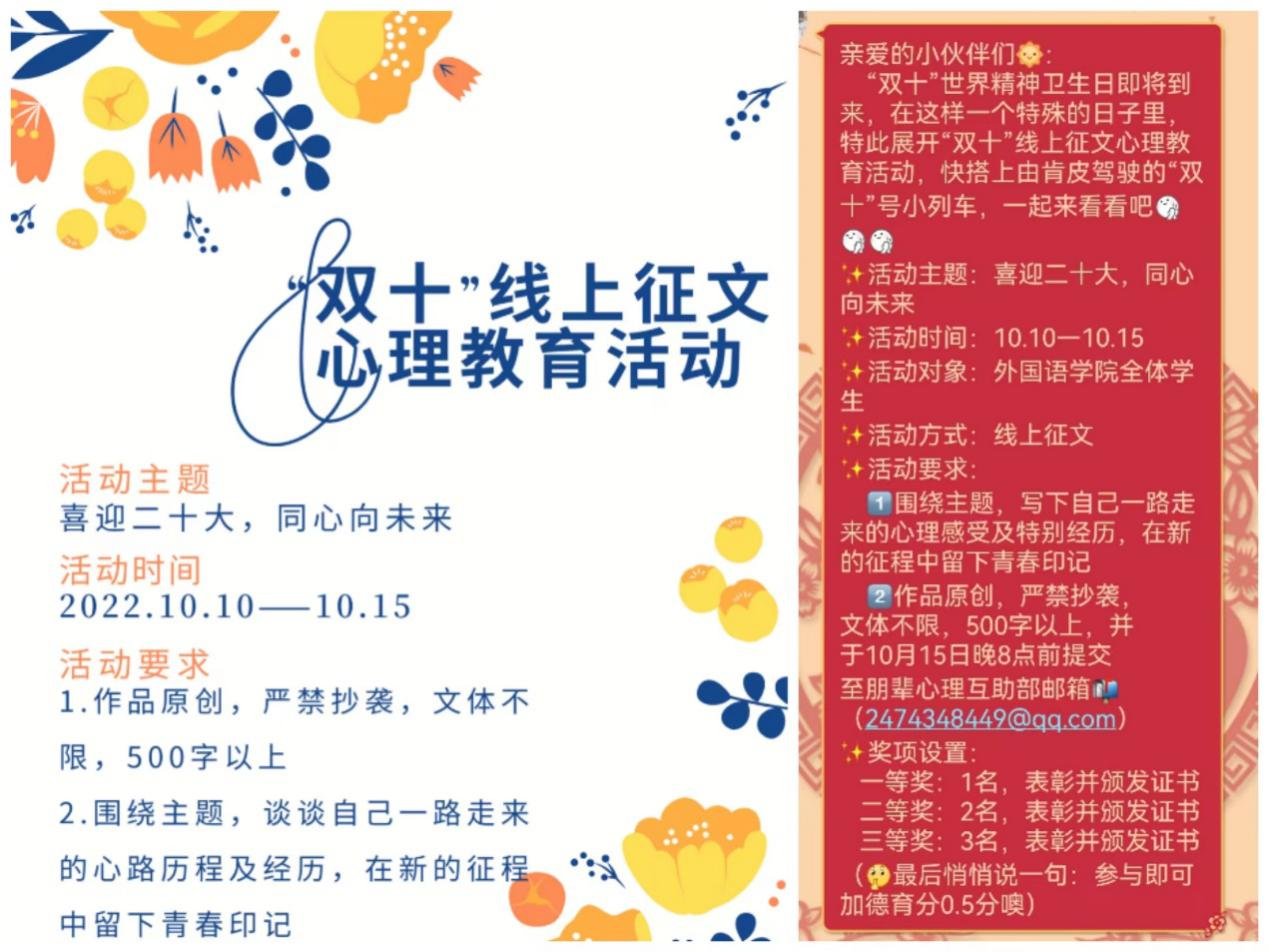 为提升大家对于心理健康的关注度及心理健康素养,推动形成良好校园氛围,外国语学院于2022年10月10日-15日特此开展以“喜迎二十大,同心向未来”为主题的“双十”线上征文活动。活动面向外国语学院全体学生,共收到征文81份。
