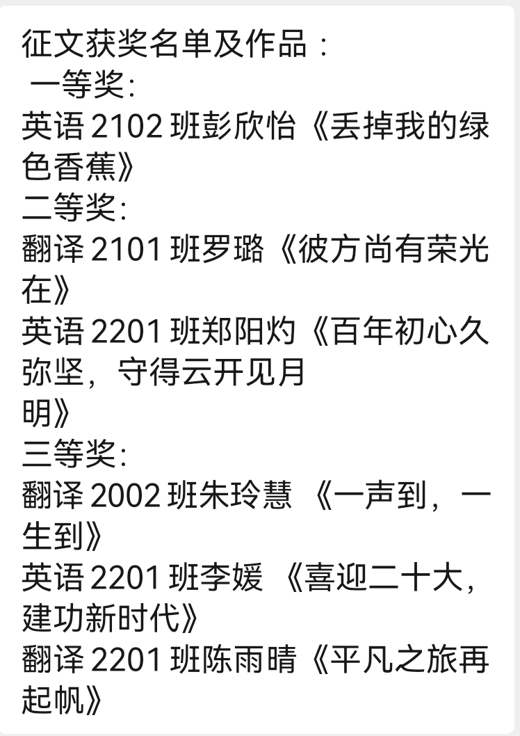 在本次活动中,同学们以征文为介,从自己的生活经历、对于时事政治的理解及未来的展望等不同的角度阐述了自己的认知自省、成长变化与志向决心,同时也表达了自己对于中共二十大召开的期待与美好祝愿。根据参与作品的内容表述与情感表达,主办方最终评选出一等奖一名、二等奖两名、三等奖三名。