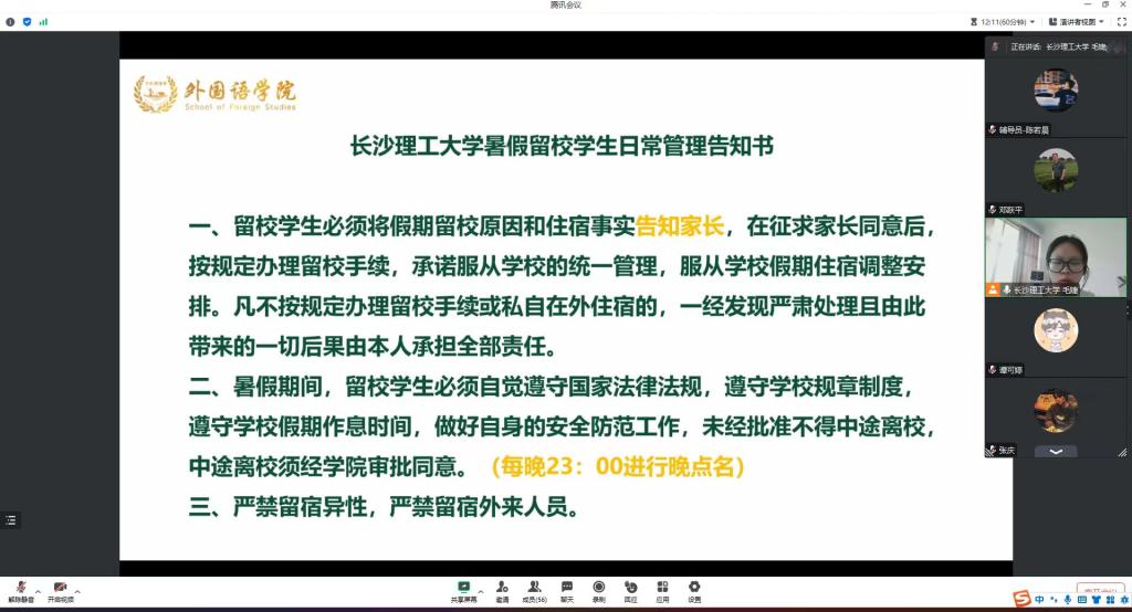 毛婕就《伟德betvlctor1946源于英国暑假留校学生日常管理告知书》进行相关解读。武巧琳、陈若晨分别从本科生、研究生暑期留校相关规定进行强调。