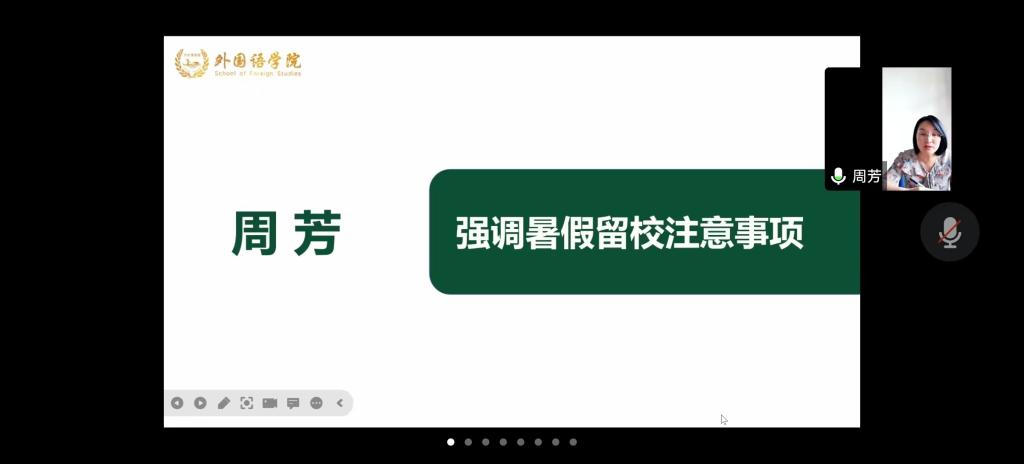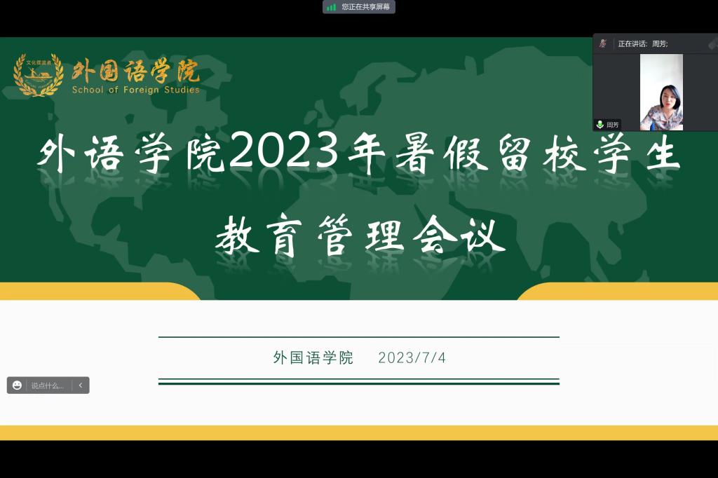 为进一步做好暑期留校安全教育工作,7月4日下午14时,外国语学院召开2023年度暑期留校学生安全教育会议,外国语学院党委副书记周芳、部分班主任及硕士生导师、全体辅导员及暑期留校学生参加会议。