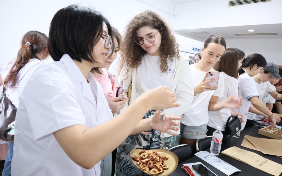 活动伊始,“文化摆渡者”志愿服务队成员宋柳柳在“医圣”张仲景雕像前,用流利的外语为营员们生动介绍了张仲景的医学成就,探究了中医文化的精髓。在中药房,营员们沉浸式体验中医药文化,近距离观察了各类中药材,领略千年医道的智慧。志愿者们耐心地为营员们讲解中药材的特点和用途,帮助他们更好地认识中医药材。