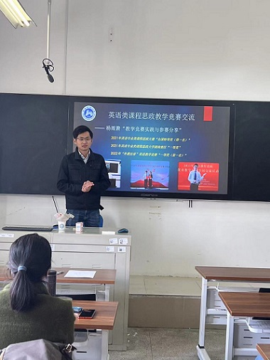 4月25日下午,为切实提升学院专业教师的教学能力和必备素养,做好2023年湖南省课程思政教学竞赛的赛前准备,外国语言文学系党支部邀请全国课程思政教学特等奖获得者湖南师范大学杨雨箫老师前来进行参赛分享与交流。此次沙龙活动在金盆岭校区九教407教室举行,支部书记姚尧老师主持,英语系和翻译系全体教师参加。