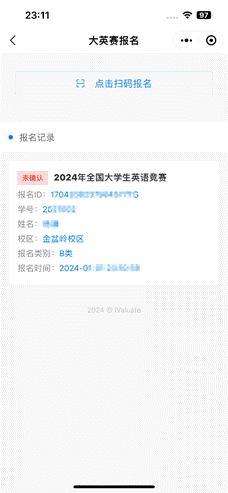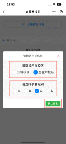 4. 点击“点击扫码报名”按钮扫描报名负责人提供的二维码,成功之后会弹出“确认相关信息”的界面,选择好校区和类别之后点击“确认报名”按钮提交报名信息。此时在页面的“报名记录”下方可以看到一个标有“未确认”的报名记录。