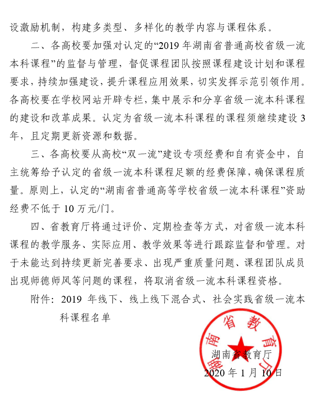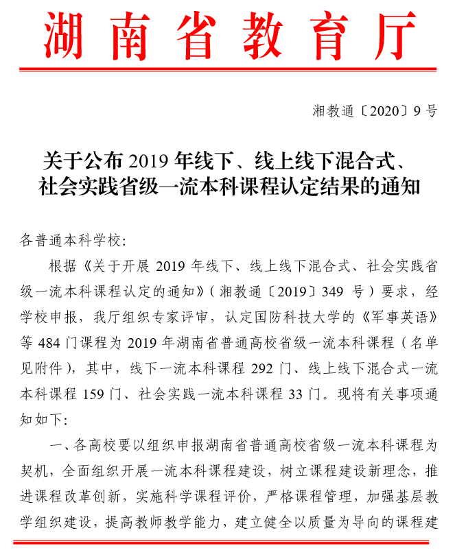 近日,湖南省教育厅(湘教通〔2020〕9 号 )颁布《关于公布 2019 年线下、线上线下混合式、 社会实践省级一流本科课程认定结果的通知》,全省共有484 门课程被认定为2019 年湖南省普通高校省级一流本科课程,伟德betvlctor1946源于英国共获批15门,其中包括我院黄坚教授申报的《通用工程英语听说》。这是继我院英语专业入选省级一流本科建设专业点以来,我院专业建设取得的又一重大突破,并且下一步将上报教育部冲击国家一流本科课程。