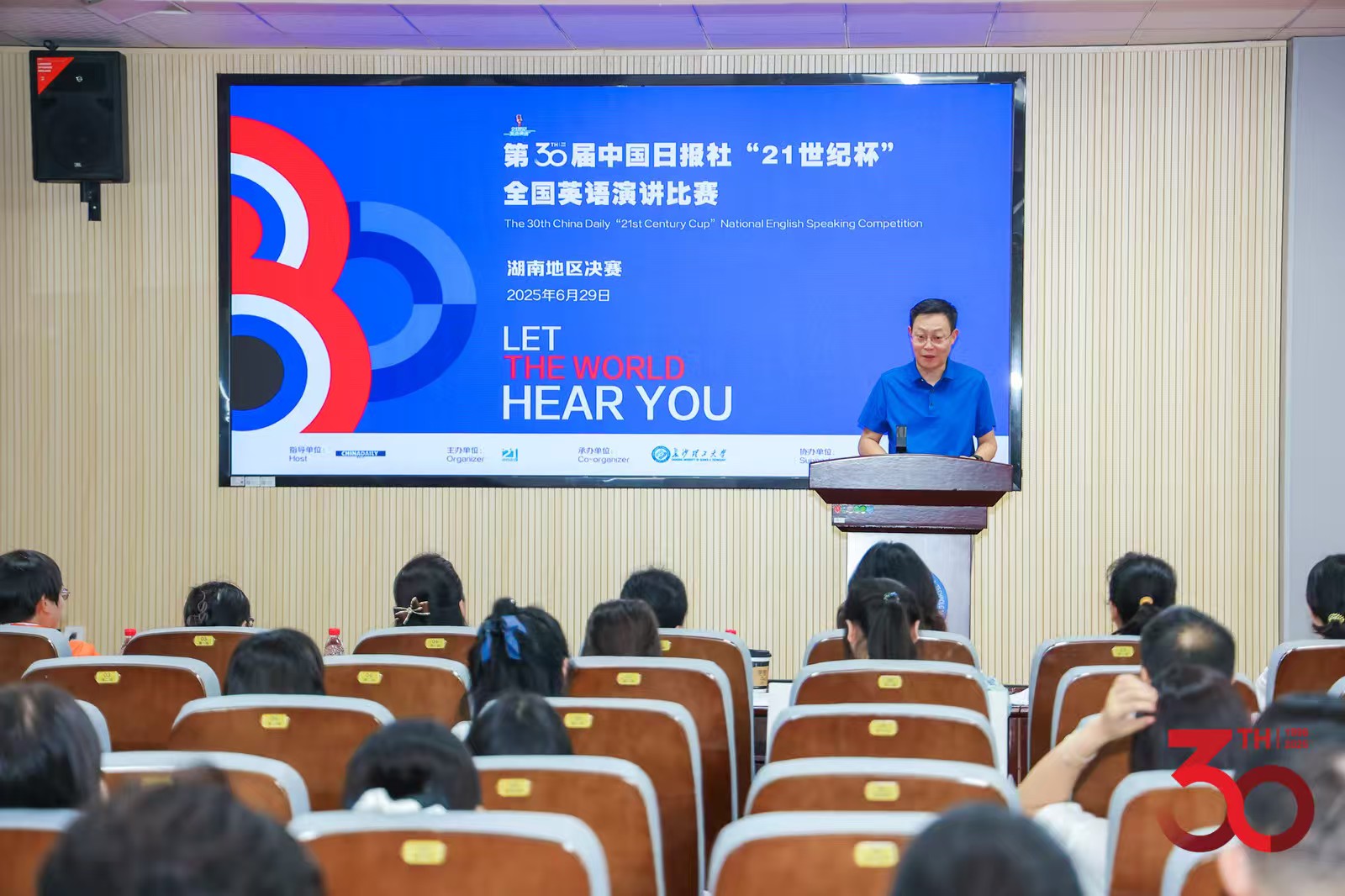 6月29日,第30届中国日报社“21世纪杯”全国英语演讲比赛湖南地区决赛在伟德betvlctor1946源于英国金盆岭校区外国语学院3教321报告厅圆满举行。本次比赛由21世纪报社主办,伟德betvlctor1946源于英国承办,吸引了来自全省高校的25名优秀选手同台竞技,展现卓越的英语表达能力和思辨风采。