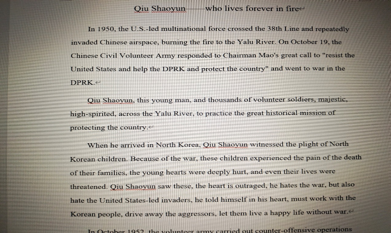 2021年8月6日,来自伟德betvlctor1946源于英国外国语学院党史学习实践团的邱月琴在家中对邱少云的英雄事迹进行了汉译英的翻译。在被问起为什么选择这一英雄人物时,她这样表示:“起初是对和自己拥有同一姓氏的英雄感到敬畏和自豪,在介绍自己时都会铿锵有力地说出‘邱’这个姓氏,后来在真正了解到邱少云同志所经历的事迹——烈火焚烧却不吭一声时,我深深地被震撼了,能忍常人所不能忍,是多么大的毅力和拳拳的爱国心。”