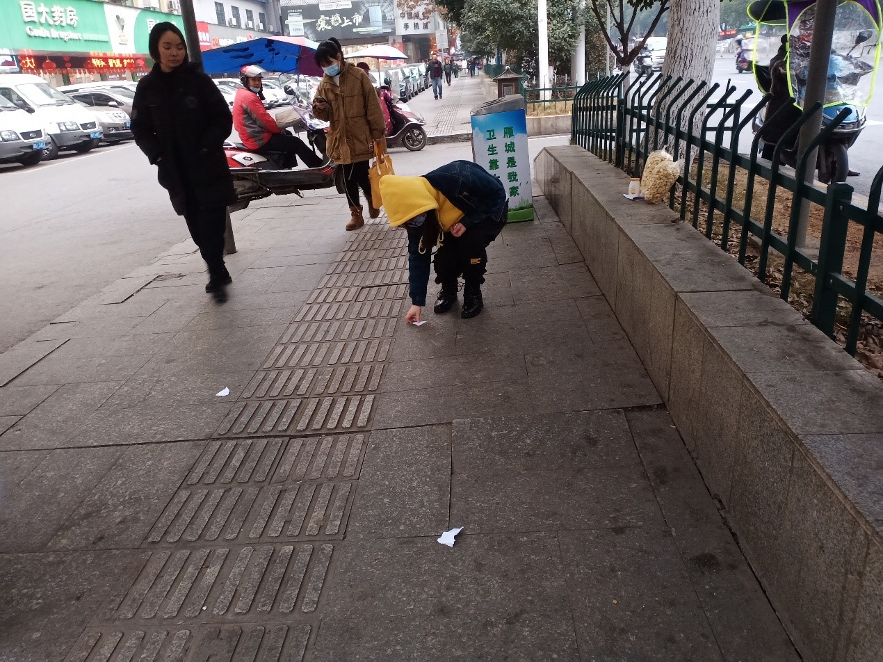 2021年1月31日,为响应学院号召,提高社会实践能力,改善城市环境,为市民服务,外国语学院英语1901班邹嘉怡来到衡阳市蒸湘区,开展“青春心向党 志愿我先行”活动。此次活动,她清理公共区域垃圾、擦拭公交车站座椅,完成清洁工作。