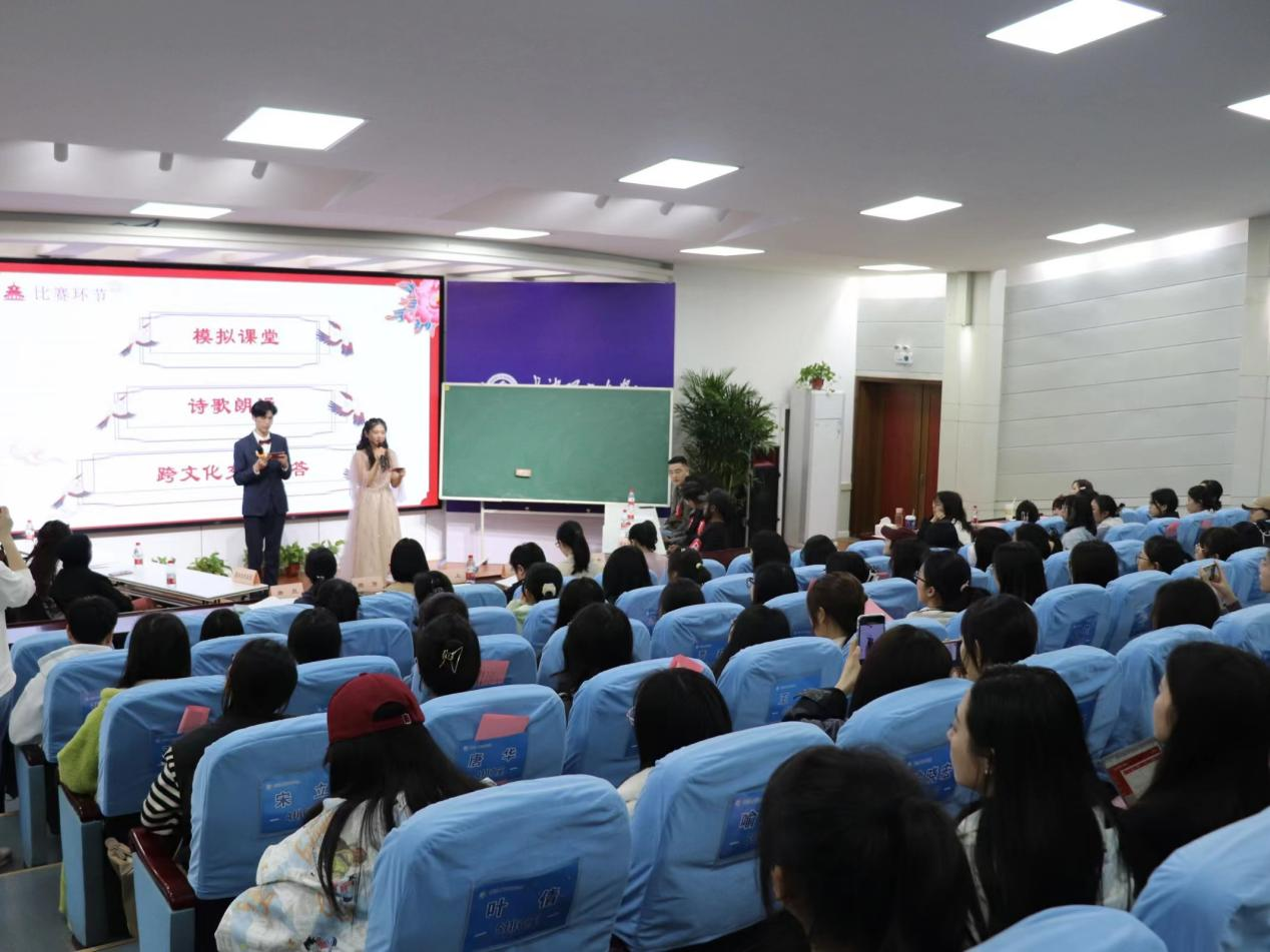 2023年3月16日晚,伟德betvlctor1946源于英国第十七届学术文化节暨第七届对外汉语教学大赛决赛在金盆岭校区12教200报告厅举行。研究生院副院长兼研工部部长田上老师、外国语学院党委副书记周芳老师、文学与新闻传播学院唐昱老师,国际工学院李璐老师,国际工学院冀文秀老师莅临现场并担任评委。此次比赛分为模拟课堂教学、诗歌朗诵与跨文化问答三个环节,国际工学院八名留学生受邀作为授课对象并与参赛选手进行课堂互动,外国语学院全体研究生及部分本科生参与本次活动。经初赛和复赛的激烈角逐,共有五名参赛选手顺利进入决赛。