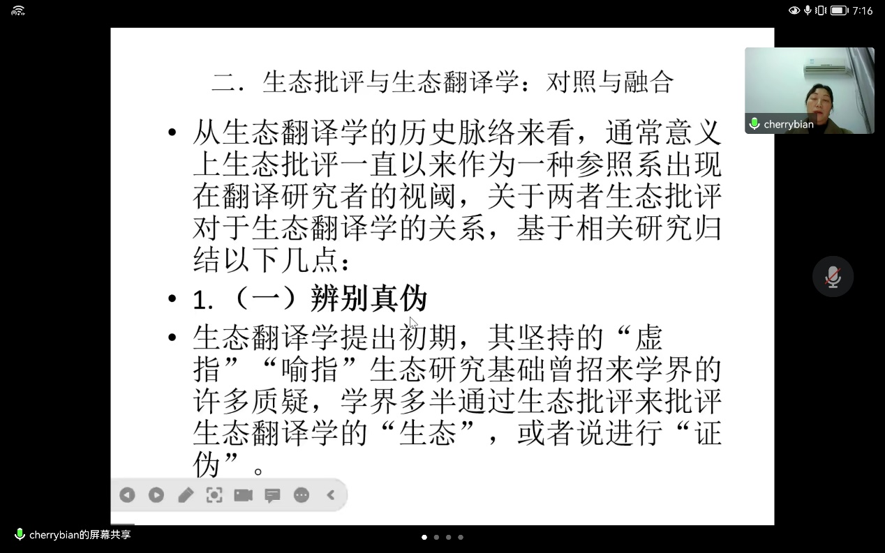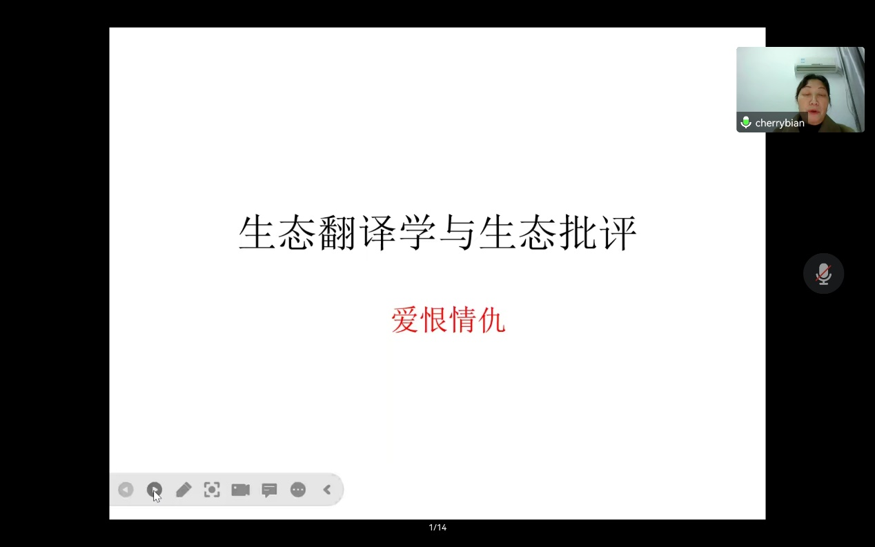 2022年12月14日晚,我院边立红副教授应邀为伟德第十八届博力学术论坛“翻译生态与生态翻译”专题论坛做了题为“谈谈翻译的自然维度”的讲座。外国语学院部分导师及全体研究生参加了本次讲座。